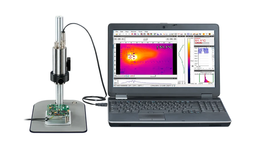 Le Xi400CF permet une mesure fiable de la température sur des objets minuscules de 240 μm. Associé à un support adapté, il permet de mesurer de manière professionnelle les cartes de circuits imprimés et les composants dans l’industrie électronique. La distance de mesure entre la caméra et l’objet est variable entre 90 et 110 mm. La mise au point motorisée intégrée permet une mise au point facile de la caméra avec le logiciel PIX Connect inclus.